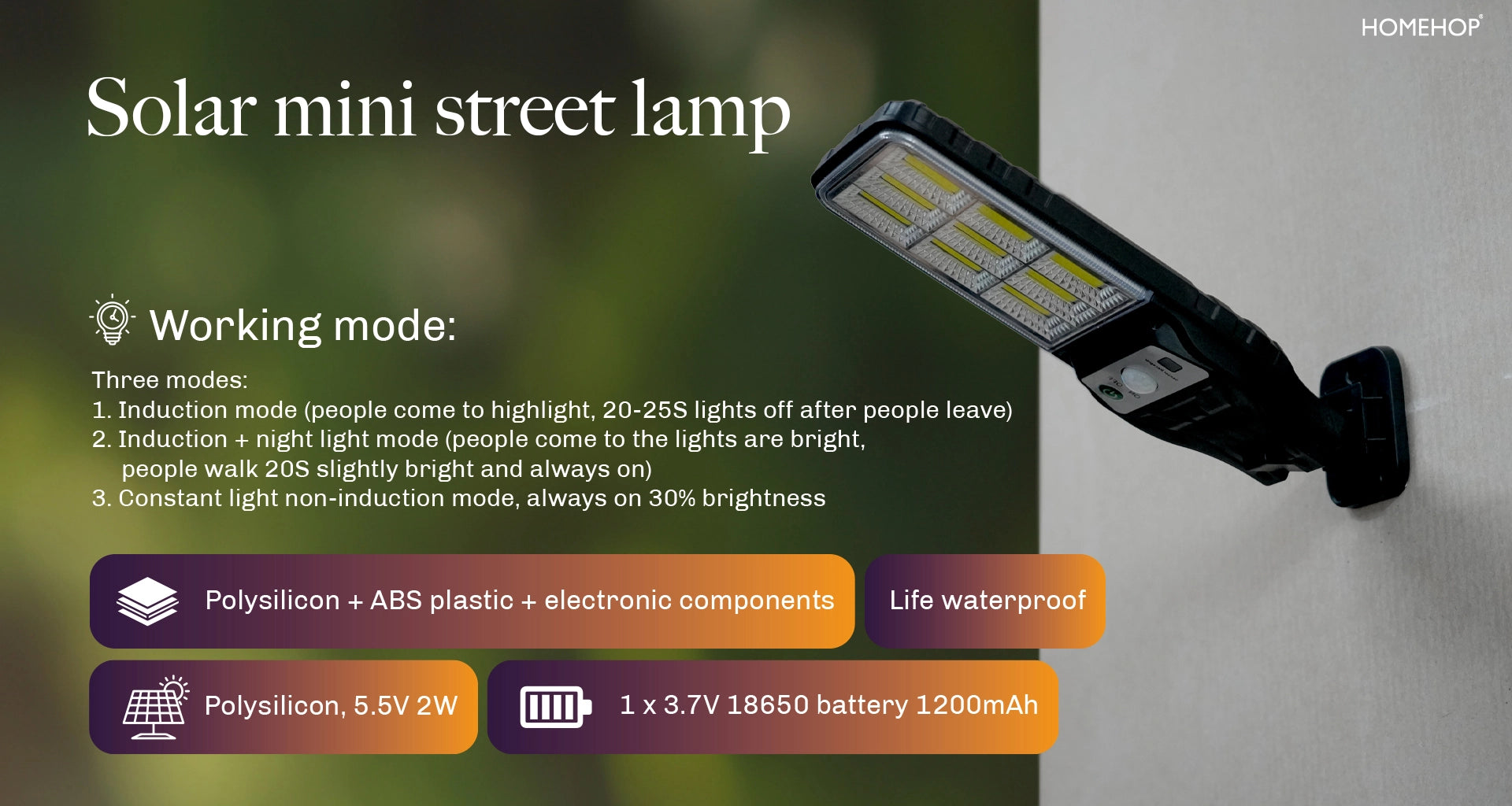 • This solar street lamp also includes three smart modes for versatile lighting options. The Induction Mode activates the lamp when motion is detected, providing bright light for 20-25 seconds. The Induction + Night Light Mode reduces the light after movement stops, while the Constant Light Mode offers consistent lighting at 30% brightness. Powered by efficient LED technology, this lamp reduces energy consumption, making it a sustainable choice for your home. With easy installation and a remote control for extra control, this solar street lamp is an excellent solution for anyone looking for reliable and energy-efficient outdoor lighting.